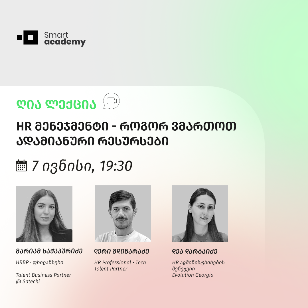 🤩 მარიამ ხაჭაპურიძე, ლერი მდინარაძე და დეა დარბაიძე ისაუბრებენ HR მენეჯერის როლისა და ადამიანური რესურსების მართვის ძირითადი პრინციპების შესახებ და მიმოიხილავენ სასწავლო პროგრამას, რომელსაც სმარტ აკადემიაში უძღვებიან